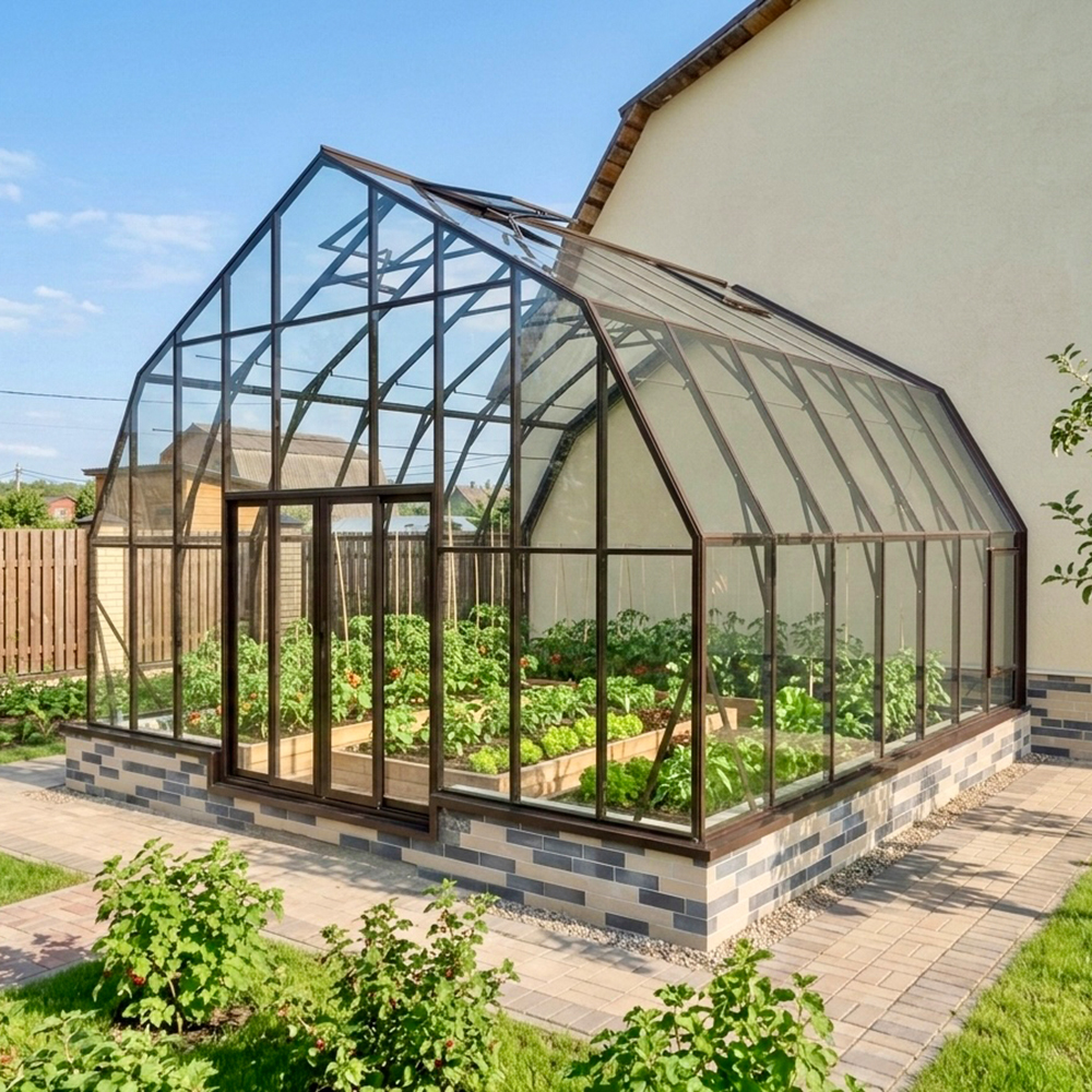Модель устанавливается на фундамент или цоколь, который обеспечивает термоизоляцию и долговечность всей конструкции. Просторный интерьер с высоким сводом позволяет комфортно работать в полный рост и выращивать даже высокорослые культуры: томаты, огурцы, перцы. Автоматические форточки в крыше обеспечивают естественную вентиляцию, поддерживая оптимальный микроклимат в любую погоду.​​​​​​​​​​​​​​​​