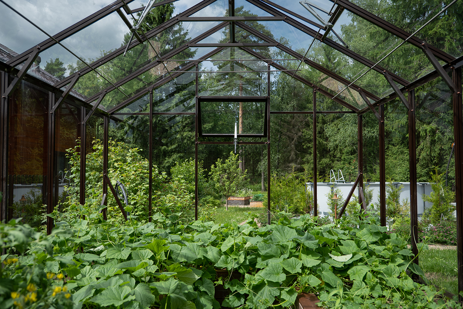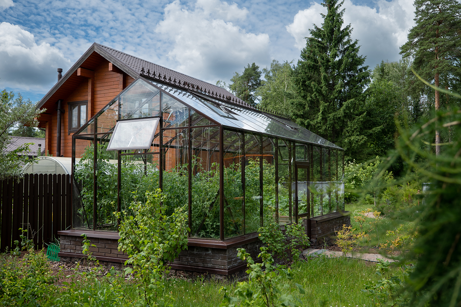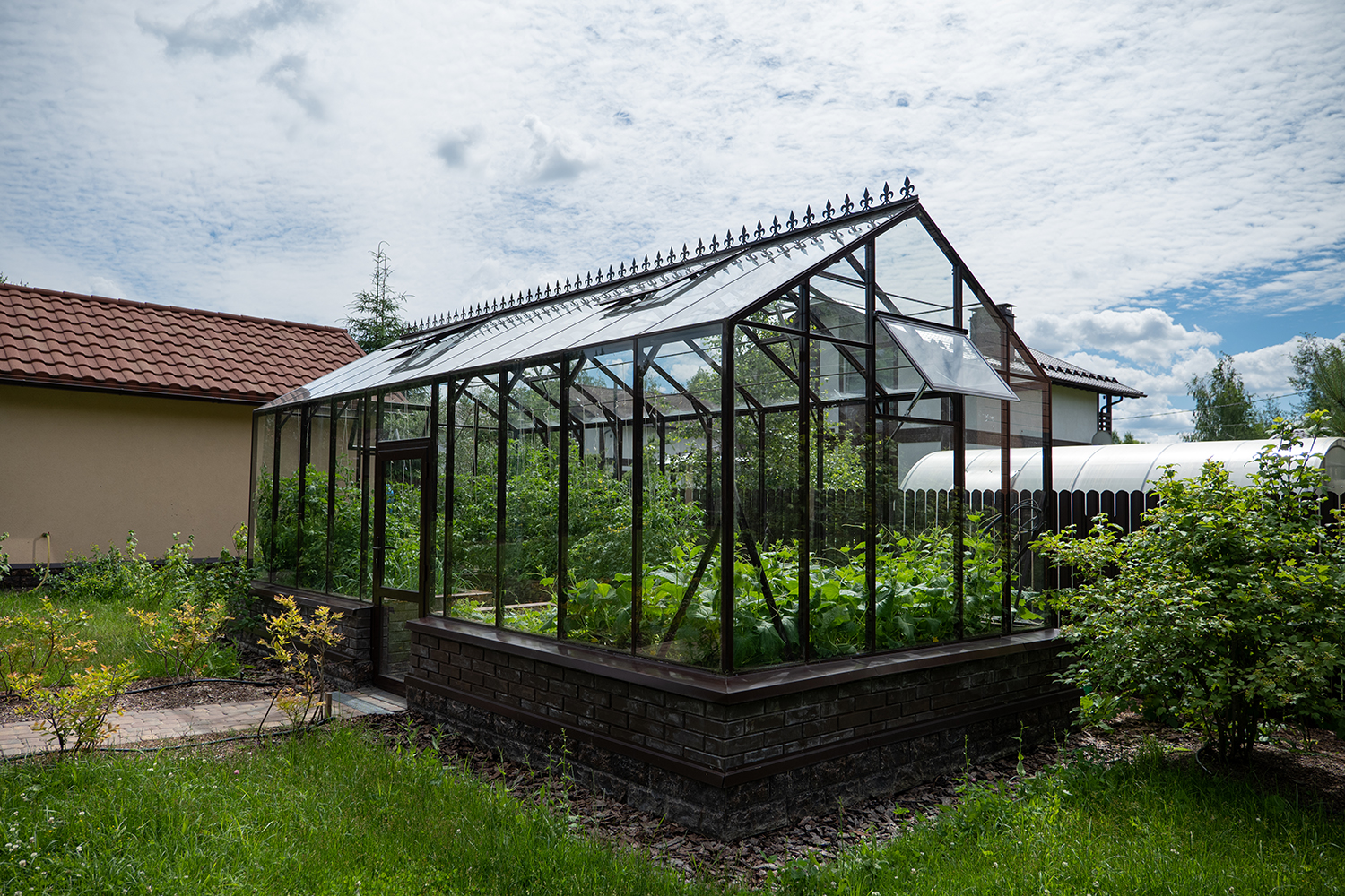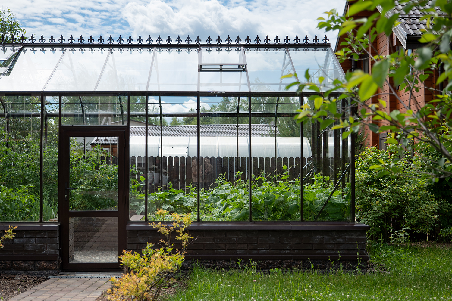 Довольно часто мы устанавливаем теплицы, у которых вход осуществляется не через торцевые двери, а через боковые. Такое расположение дверей подойдет в том случае, когда вход в теплицу с торца затруднен, например, забором, постройкой или особенностями ландшафтного дизайна!