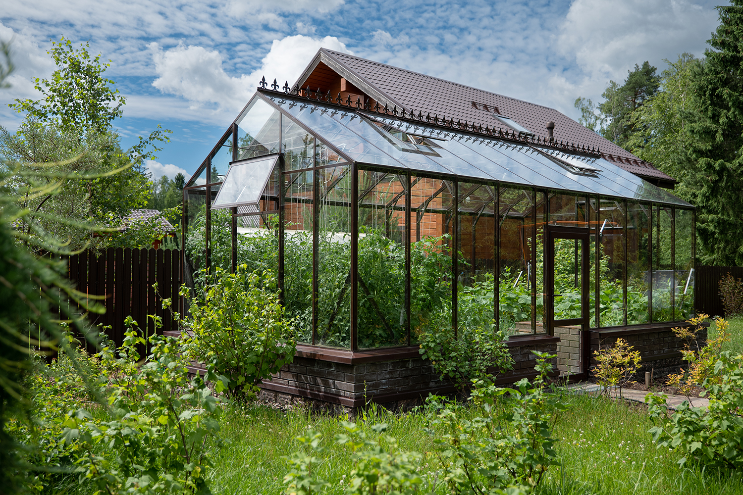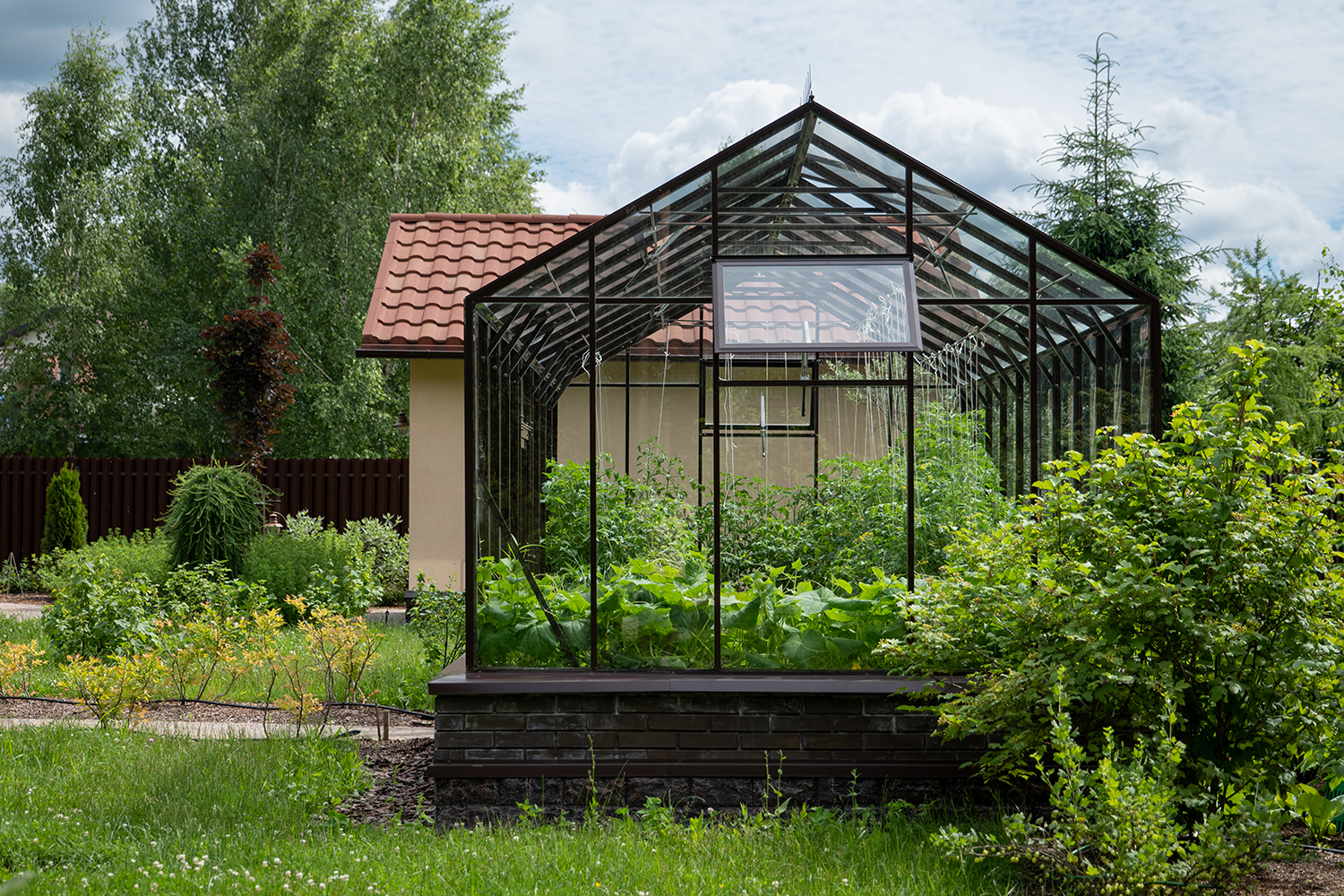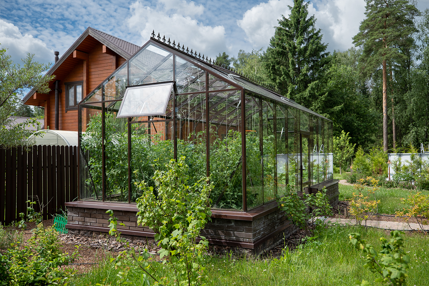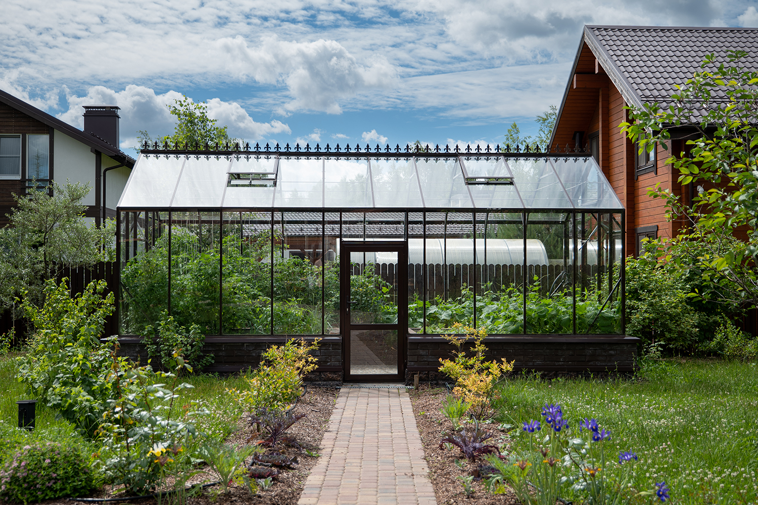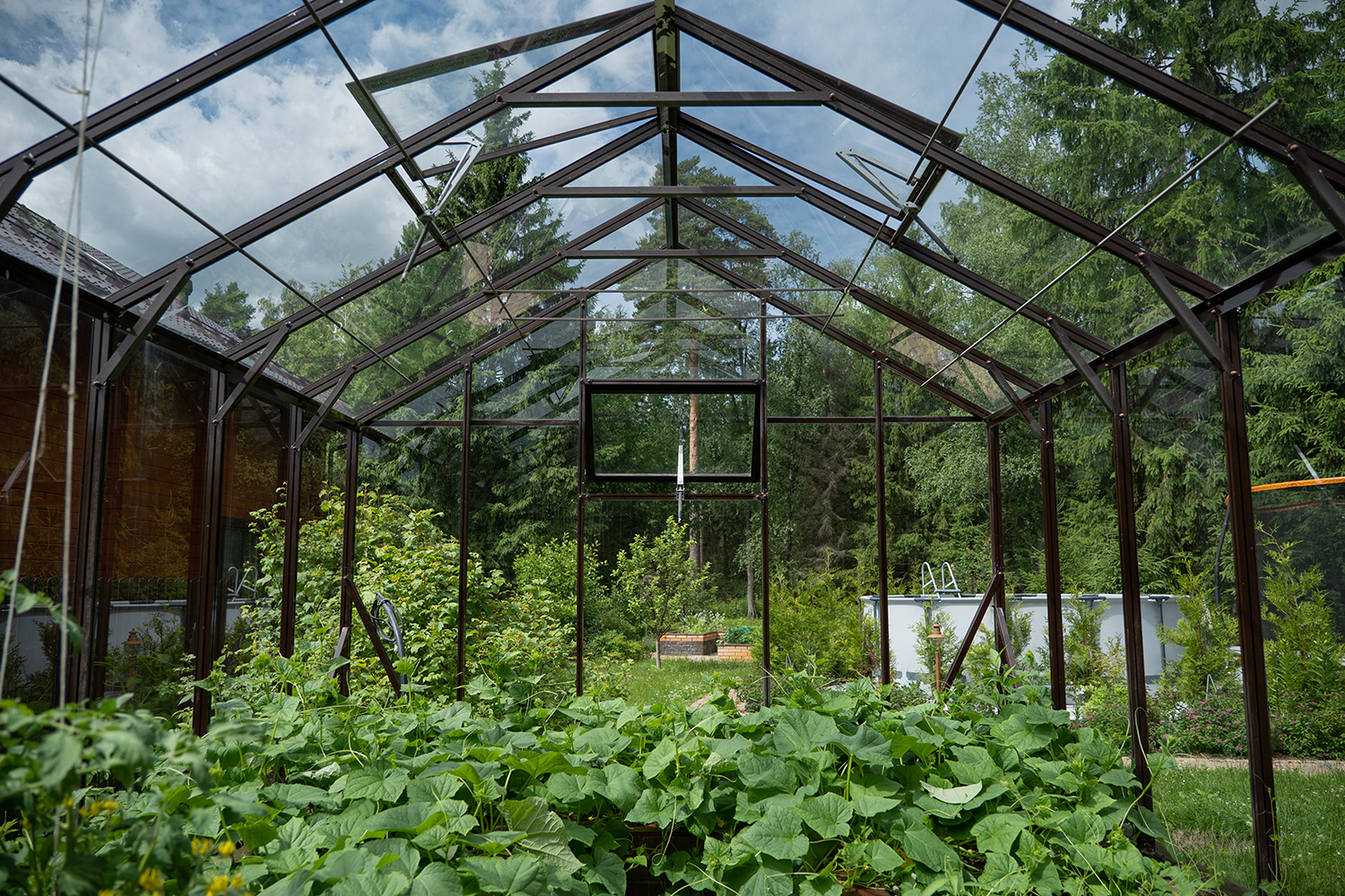 Довольно часто мы устанавливаем теплицы, у которых вход осуществляется не через торцевые двери, а через боковые. Такое расположение дверей подойдет в том случае, когда вход в теплицу с торца затруднен, например, забором, постройкой или особенностями ландшафтного дизайна!